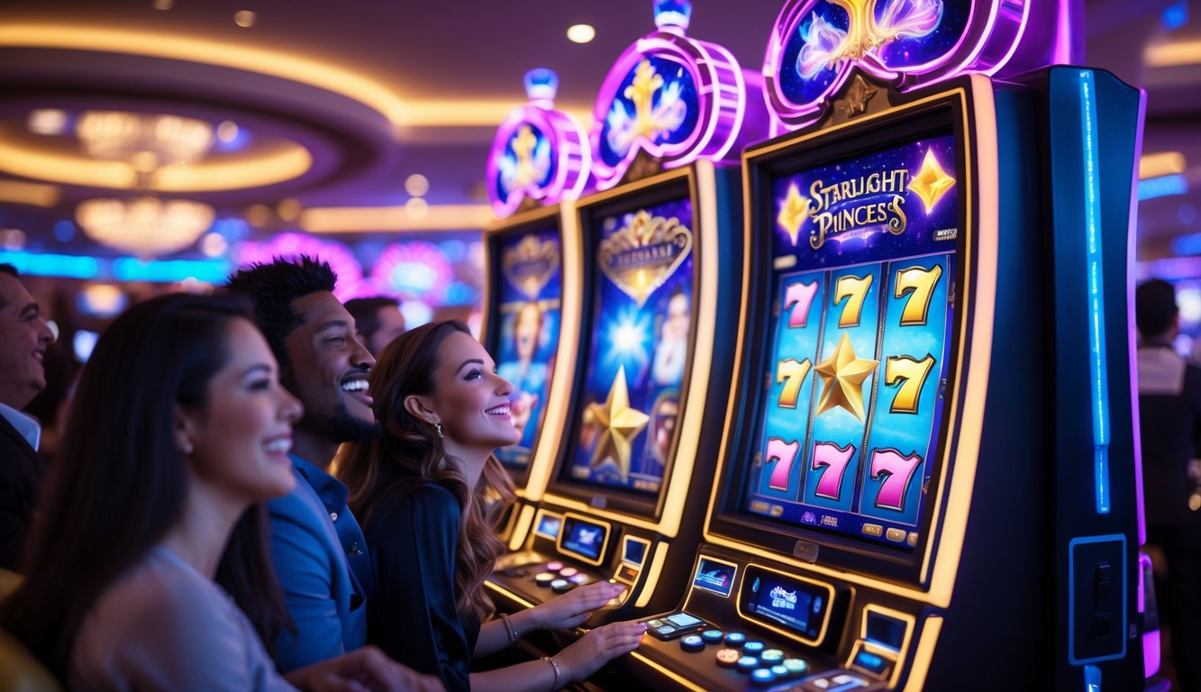 Mesin slot Starlight Princess yang berwarna-warni dengan lampu menyala dan tangan pemain siap menekan tombol putar di kasino.